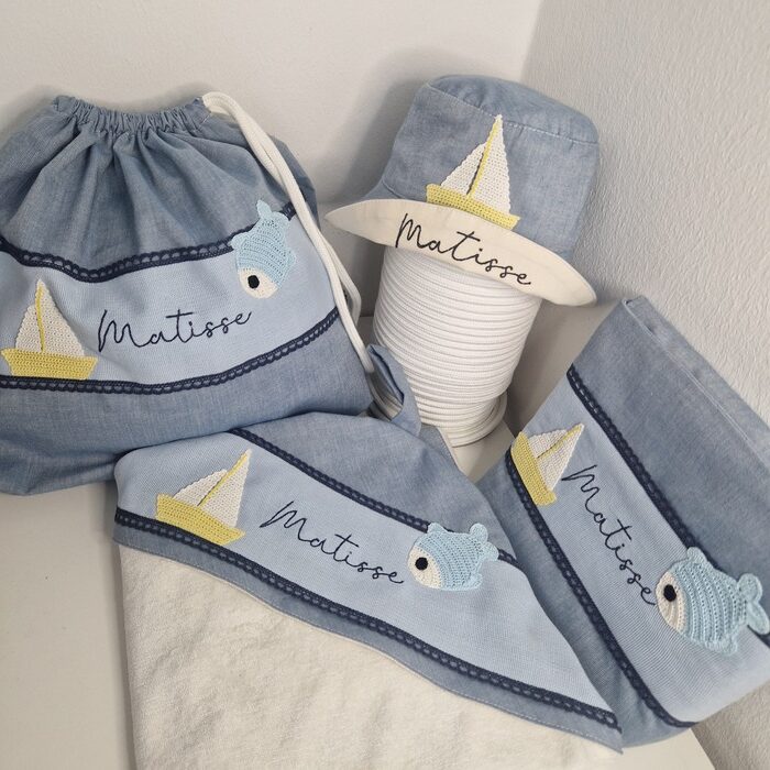 Personalized with the baby’s name embroidered in gold.